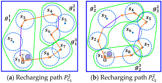 According to Equation (12), the lengths of and can be calculated. The distance from sensor to the recharging segment should be equal or less then , in order to guarantee the full recharge of sensor . In addition to the first task, the next task aims to further construct the recharging segment and the reduced subpath for each group.