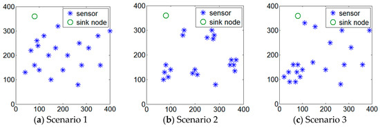 In each scenario, since the location of each sensor has been known, the proposed algorithm will select the southeast sensor, whose location satisfying condition , as the first sensor of path . This sensor will be denoted by . Then the path can be constructed by applying the proposed algorithm presented in Section 4.5.