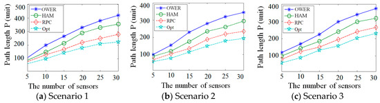 Figure 11 depicts the recharging path length in three scenarios by applying the four compared algorithms. The number of sensors is ranging from 5 to 30. In general, In Figure 11a–c, the path lengths of four compared algorithms are increased with the number of sensors. This occurs because that the size of area covered by sensors can be enlarged when the number of sensors increased. Therefore, the mobile recharger needs to visit a larger area, leading to the incensement of recharging length. Consider the scenario 1. As shown in Figure 11a, the OWER-MDG mechanism constructs several tours to recharge all sensors in the network. For each recharging tour, SenCar travels along a specific path consisting of some anchor sensors with heavy data traffic. Since the path constructed by OWER-MDG does not visit all sensors in each tour, the recharging path for all sensors can be treated as the connected path of the tours that are constructed by several runs. As a result, the OWER-MDG has longest path. In the HAM-based recharging mechanism, the recharging path is constructed passing through the location of each sensor. Therefore, the recharging path length obtained by applying the HAM-based recharging mechanism is shorter than the OWER-MDG mechanism.