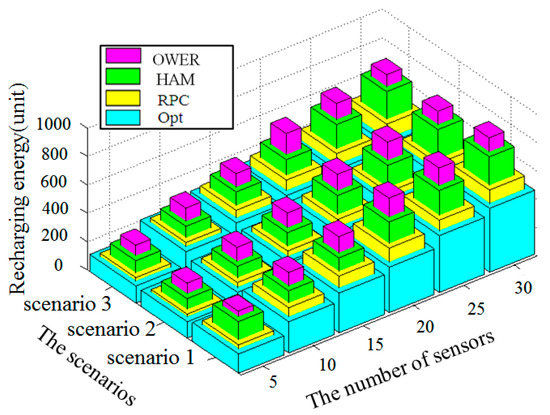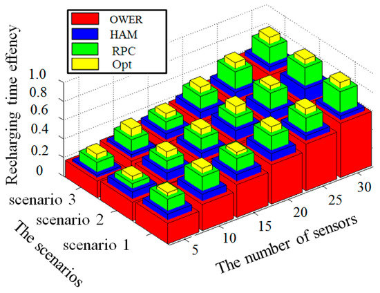That is, when the applied algorithm is HAM-based recharging algorithm, scenario 2 has the best efficiency. Similarly, no matter whether OWER-MDG or the proposed PRC algorithm are applied, scenario 2 has the best efficiency. The derivations also match the results as shown in Figure 13.