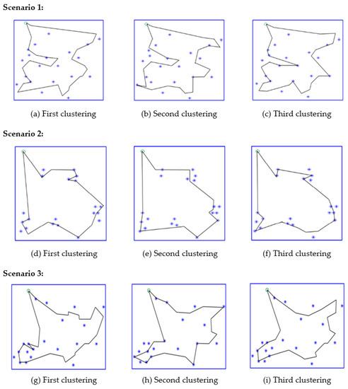 Scenario 2 has different results. Alternatively, the second clustering mechanism, as shown in Figure 14e, obtains the shortest path. In scenario 3, the proposed RPC chooses the third path, as shown in Figure 14i.