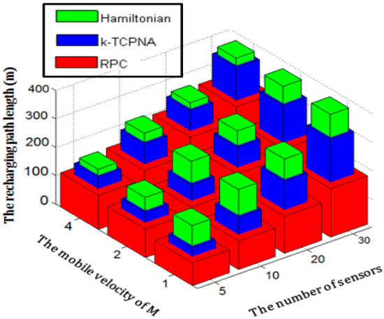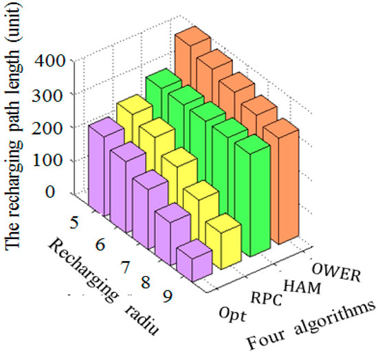 In general, the recharging range of a sensor is an important parameter on the impact of recharging path length. Figure 16 shows the impact of recharging radius on the path length by applying the three compared algorithms. In the Hamiltonian algorithm, the recharging path passes through the center of each sensor, the change of recharging range has no effect on the recharging path length.