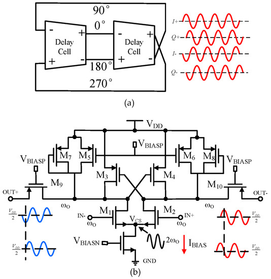 The block-level diagram of the proposed quadrature oscillator and the circuit implementation of each delay cell are shown in Figure 1a,b respectively. The core of the circuits is two cross-coupled inverters. The N-type MOS (NMOS) transistors, M1 and M2, form the input pair to increase the transconductance for high-frequency operation. The two cross-coupled PMOS transistors, M3 and M4, provide negative resistance and positive feedback for the oscillation. The tuning is achieved by adjusting the gate voltage of PMOS transistors M5 and M6, while diode-connected transistors M7 and M8 serve as a load for the input. The PMOS bias voltage VBIASP is nominally equal to the control voltage. The outputs of the oscillator are added to the PMOS transistors M7 and M8 to improve the linearity. The bias works in the near-threshold region to reduce the power.