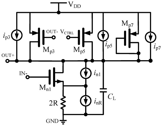 The equivalent half-circuit with noise sources is shown in Figure 3. The relative SSB (single side band) phase noise PSD (power spectrum density) of the proposed quadrature VCO deduced from [13] is shown in Equation (5), where f is the offset frequency, f0 is the oscillating frequency, IDM is the current flowing through the transistor, I is the current of the output node, L is the assumed equal channel length, k is the Boltzmann constant, and other coefficients μ, K, T, γ are the process relative parameters. From Equation (5), the phase noise of the proposed quadrature VCO is independent of the number of delay stages, and it depends on the oscillation frequency, the charge/discharge current of the output nodes, and the transconducdance of transistor Mn1. In Equation (5), these noise sources come from the disturbance from VDD and the ground. If the circuit is immune to the above disturbance, the noise performance of the oscillator will be improved. Here a self-bias circuit is proposed for isolating the change in the supply and ground.