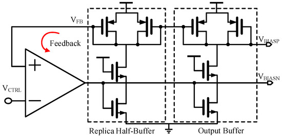 The self-biasing avoids the fixed bandgap bias circuits by generating all of the internal bias voltages and currents from each other so that the bias levels are completely determined by the operating conditions. This self-biasing can also remove the constraint of the process and environment variability. By referencing all bias voltages and currents to other generated bias voltages and currents, the operating bias levels of the core are essentially established. The architecture of the self-bias circuit, shown in Figure 4, produces the bias voltage VBIASP and VBIASN from VCTRL. The self-bias circuit is realized with a differential amplifier and feedback buffer stages. This self-bias circuit is used to generate IBIAS, and the replica half-buffer stage translates this current to VCTRL through the diode-connected device. The feedback amplifier adjusts the bias current IBIAS, and thus the voltage swing of the buffer is equal to VDD − VCTRL. Therefore, this biasing technique dynamically adjusts the bias current in each buffer stage and hence maintains the relation VDD − VCTRL = IBIAS × RLOAD against the process and supply voltage.