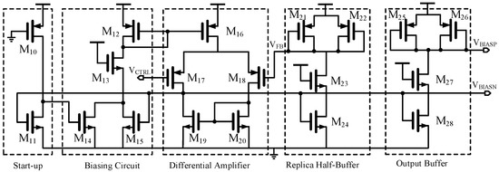 The whole self-bias circuit is shown in Figure 5. A start-up circuit composed of a PMOS transistor and a NMOS transistor drives the circuit off the degenerate point. For the rest part of the bias generator, it uses a differential amplifier to force the VFB of the replica half-buffer equal to VCTRL, which produces the bias voltage VBIASN of the NMOS current source, and provided the limit swing of VCTRL. A replica buffer stage is used to prevent the VBIASP from being disturbed by the control voltage VCTRL due to the coupling capacitance.