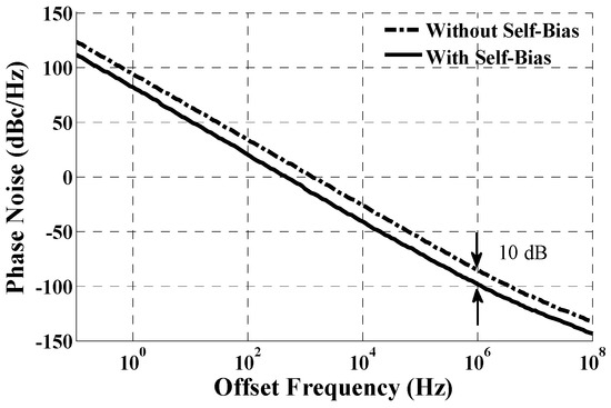 The differential amplifier is realized with negative feedback architecture, and thus the frequency response and the stability should be considered. The bandwidth of the differential amplifier is set as wide as the operating frequency of the VCO so the bias can track the disturbances from the supply and ground immediately. Therefore, the main noise source of the oscillator is eliminated and the noise performance is improved. The differential structure also helps in rejecting the common noise from the substrate and supply [14]. Both optimum and non-optimum designs are simulated with Cadence Spectre for comparison. The simulation result is illustrated in Figure 6. It can be observed that the phase noise of a normal-ring VCO without self-bias is −90 dBc/Hz at a 1 MHz offset, and the phase noise with a self-bias circuit has nearly a 10 dB improvement than that of the circuit without self-bias, with only a 5% power overhead.