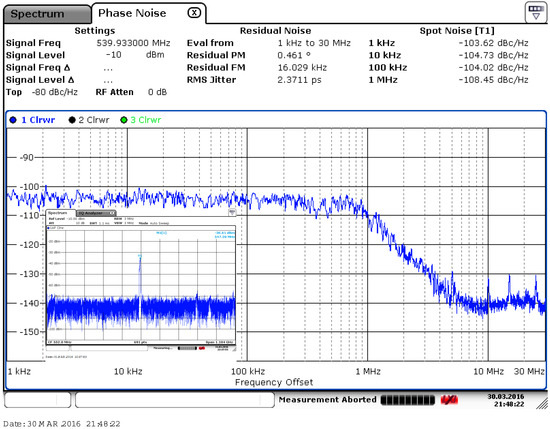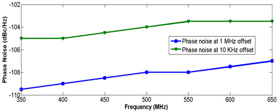 Measured phase noise at different offset frequencies.