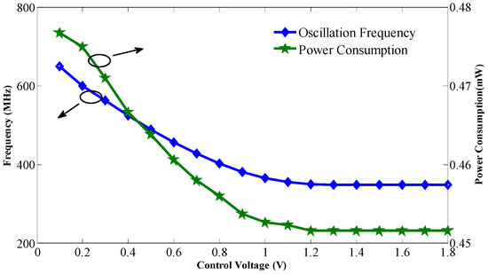 As the circuit is sensitive to disturbances from the ground, a careful layout and shield from the ground are needed [15]. The chip is fabricated in the UMC 0.18 μm CMOS process, and the die photo is shown in Figure 7, where the core including the buffer and test circuits just occupies a 0.0006 mm2 area. The phase noise measured by the Rohde & Schwarz FSV7 Signal Analyzer (Rohde & Schwarz, Munich, Germany) is shown in Figure 8; it achieves −108.45 dBc/Hz at a 1 MHz offset with a center frequency of 540 MHz. The use of the self-bias circuit alleviates much of the phase noise contributed by the supply. As the supply or substrate noise is the dominant noise source of this system, the proposed VCO achieves a low phase noise that can be compared to that of LC-VCOs with a high Q resonator. The measured tuning range and power consumption are shown in Figure 9. The oscillator has a tuning range of 340 MHz from 349 to 689 MHz when the tuning voltage varies from 0 V to 1.1 V. As shown in Figure 1, when the control voltage is larger than 1.1 V, the tuning PMOS transistor will be turned off, and the frequency of the oscillator will decrease to its minimum and not change any more. The gain of the oscillator is nearly 0.309 MHz/mV with a control voltage from 0 to 1.1 V. Figure 9 shows that the power consumption is linearly proportional to the oscillation frequency and the power consumption is 453 μW at a 0.9 V control voltage. The measured phase noise at different offset frequencies is given in Figure 10. The control voltage was set from 0.8 to 0.2 V for the phase noise measurement, and it achieves a better result from a 10 KHz to a 1 MHz offset, and a phase noise degradation of up to 2.5 dB was observed at the 1 MHz offset frequency across the tuning range.