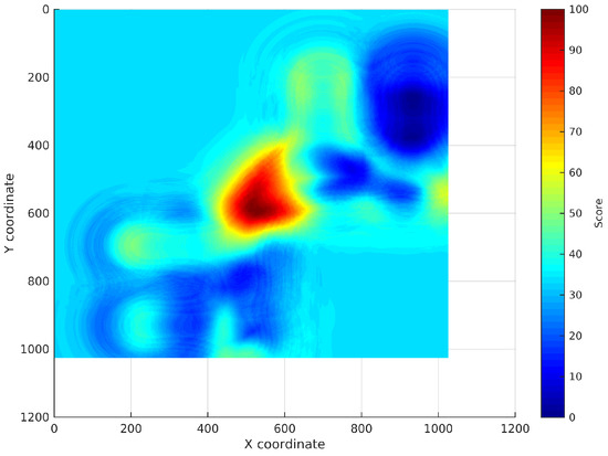 Figure 4. Resulting surface: sum of all of the APs’ localization subsurfaces for a test sample collected at an unknown coordinate. - Application of an environment mask:The surface generated in the previous step can contain inaccessible areas outside the building. In addition, in certain applications, only certain areas of the environment are reachable for users. For instance, a museum visitor cannot access the storage rooms. To remove these unreachable areas, a mask is applied to the surface obtaining a new surface where only the reachable coordinates have a score (Figure 5a).