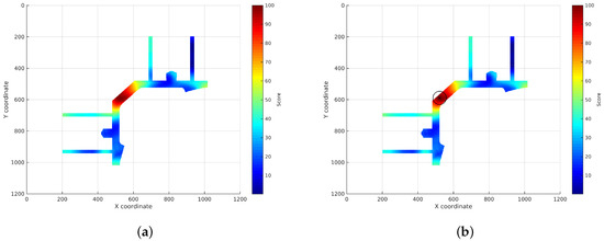 Figure 5. Resulting surface applying a mask of the environment to allow only reachable coordinates. (a) Masked surface to the reduce allowed locations; (b) location of the device. - Estimation of the device location:Finally, the location of the device will be estimated as the coordinate with the highest score in the resulting masked surface (Figure 5b).