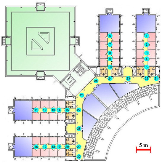 The proposed WiFi localization system has been tested in a complex real-world environment with a surface of 3000 m. The experiments have been performed on the third floor of west wing of the Polytechnic School at the University of Alcalá (UAH) (Figure 6). In this building, mainly made of concrete, the signal measurement is highly affected by the multipath effect [49] (reflection, refraction, shadowing and scattering, which causes a deviation from the original transmission to the device). In the experiments, 105 APs, deployed over the environment with the aim of providing Internet access to the students, but disregarding localization purposes, have been detected. Measurements collected at 30 significant topological positions have been considered to train the system (circled numbers in Figure 6). At each position, 30 fingerprints have been collected and averaged. As a consequence, one fingerprint per topological position has been used as training data. The continuous reference surfaces have been created using the averaged RSS at the 30 topological positions for all of the existing APs.