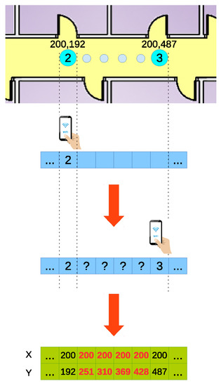 The ground truth for the trajectories has been manually tagged: when the person carrying the device steps over a position existing on the training dataset, the sample is marked with the corresponding number of the position. With the assumption that a person walks at a constant speed of 1 m/s, each trajectory will be composed of samples measured one meter apart from each other. This means that most of the samples are measured in positions not covered in the training data and, as a consequence, with unknown coordinates. To tag these samples, we assumed that the user performing the test moves at a constant speed when moving from one known position to the next one. This way, the coordinates of the untagged samples are calculated by dividing uniformly the trajectory between two positions in a number of sections equal to the number of untagged samples (Figure 7).