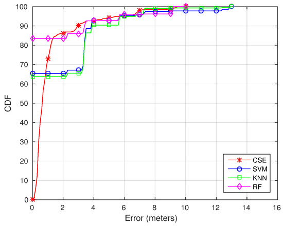To fully understand the results, Figure 8 shows a comparison of the Cumulative Distribution Function (CDF) using CSE, RF, SVM and RADAR. The CDF shows an analysis of the distance to the ground truth coordinate for the different classifiers. As can be seen, the error is lower using CSE (except for the samples when RF, SVM or RADAR locate the device as the correct position, where the error is zero). The error is under 2 m for the 86th percentile using the CSE algorithm, under 2 m for the 83th percentile using the RF-based algorithm and under 2 m for the 65th percentile for the SVM and RADAR methods.
