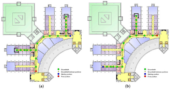 On the first trajectory, a user was walking along the main, second and fourth corridors in a path of approximately 120 m at a mean speed of 0.73 m/s. Figure 9a shows the trajectory followed during the first experiment. This trajectory starts at the position marked with a blue circle and continues along the green and yellow dot path to the final position marked with a red circle. Green circles indicate the site-surveyed positions, while the yellow dots are locations where there are available measurements not corresponding to a position in the fingerprint database. On the second trajectory, the user was walking along the main, first and third corridors in a path of approximately 100 m at a mean speed of 0.73 m/s. This trajectory followed the opposite direction to the previous one along the main corridor; this way, all of the positions are covered at least twice with different orientations. Figure 9b shows the second trajectory with the same format as in Figure 9a.