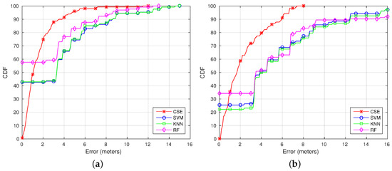Figure 10 shows the CDF for Trajectories 1 (Figure 10a) and 2 (Figure 10b). As can be seen looking at the CDFs, the error is lower using CSE most of the time (again, except for the samples when RF, SVM or RADAR locates the device as the correct position, where the error is zero). For Trajectory 1, the error is reduced from 3.85 to 2 m for the 75th percentile and from 7.25 to 3.5 m for the 90th percentile. The same way, for Trajectory 2, the error is reduced from 6.8 to 3.32 m for the 75th percentile and from 12.35 to 5.92 m for the 90th percentile.