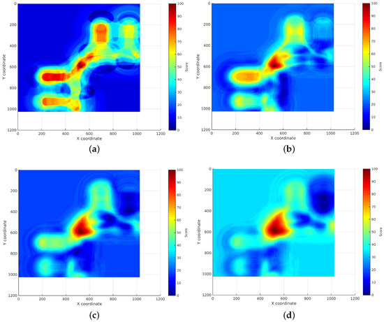 Finally, Figure 12 shows examples of the localization subsurfaces obtained using different margin errors, namely 1, 5, 10 and 15 dB. As can be seen, as the margin is increased, the areas with higher scores (orange-red ones) are reduced, obtaining one high-scored area for margins above 10 dB and, as a consequence, reducing the uncertainty for the device position.