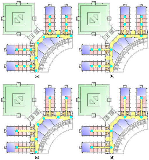 Figure 13 shows the different manually-selected configurations used to train the system. These configurations have been chosen by selecting the topological positions located at the beginning, center and end of the corridors for Configurations 1 and 2 (Figure 13a,b). Then, Configuration 3 (Figure 13c) has been created removing some positions from Configuration 1 and Configuration 4 (Figure 13d) removing some positions from Configuration 2.
