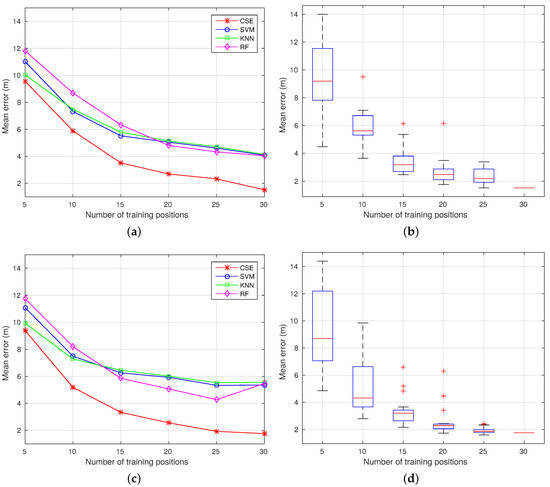 Mean error evolution changing the number of randomly-selected training positions. (a) Trajectory 1: mean error; (b) Trajectory 1: CSE boxplot; (c) Trajectory 2: mean error; (d) Trajectory 2: CSE boxplot.