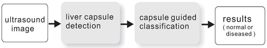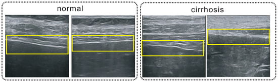 Ultrasound, CT and MRI are routinely used in the diagnosis of cirrhosis. Medical ultrasound imaging as a non-invasive and non-ionizing technique has been widely used by doctors to diagnose cirrhosis. Computer-aided diagnosis systems can be used to diagnose cirrhosis at an early stage based on ultrasound images for timely treatments [2]. B-scan ultrasound imaging produces a specific texture pattern which reflects the spatial distribution of the tissue scatterers relative to the wavelength of the incident pulse. The obtained B-scan ultrasound image appears as a granular texture [3]. High frequency ultrasound imaging can obtain the superficial section images of the liver with higher resolution that reflect more subtle changes in the liver capsule and parenchyma at early stage of cirrhosis, which is better than the traditional convex array ultrasound probe [4]. For a normal liver, the parenchyma has homogeneous echotexture, and the liver capsule is smooth with even thickness. The progression of cirrhosis will result in damaged parenchyma tissue, fibrosis and formation of pseudolobule. The liver capsule will be manifested as thickening or have uneven thickness, with wavy, jagged, and stepped changes as shown in Figure 1.