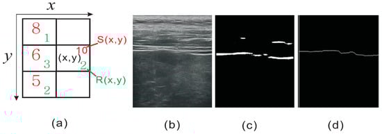 An example is given in Figure 4a, the summed score at the middle-right pixel is computed as the sum of maximum values of left pixels and (). When computing the score, each pixel location preserves the precedent pixel location to the left. A path with the maximum score can be determined by firstly finding the pixel on the right side of the image with the maximum s. Since each pixel preserves the precedent one, a complete path can be determined by backtracking the pixel locations. By finding the path with the maximum score, a complete liver capsule which effectively links the fragmented detections and filters out false positive detections can be extracted. One sample of liver capsule detection is shown in Figure 4.