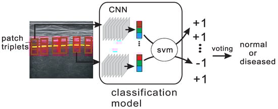 The output of the fully connected layer (before softmax loss layer) is used as the feature of our image classification problem as shown in Figure 6. The features of the three patches are concatenated as one feature vector: . The feature vector then serves as input of SVM, and by training the SVM model, we are able to fine-tune the pretrained CNN model to fit our problem. The final decision of a image I is made by combining the SVM classification results of all the M patch triplets :