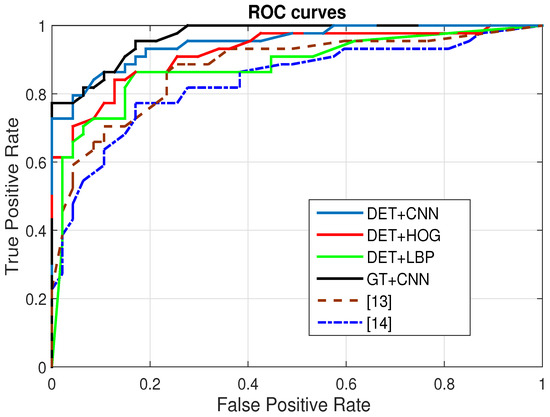Since our image classification can be equipped with various kinds of low level feature extraction method other than the CNN model presented in this paper, this can be viewed as different variants of proposed method. We tested two kinds of low level features: histogram of oriented gradients (HOG) and local binary pattern (LBP) (DET + HOG and DET + LBP). The ROC curves are shown in Figure 9, and the classification accuracies are listed in Table 3. From the results, we can see the proposed CNN model outperforms the two variants with the HOG and LBP by a large margin.