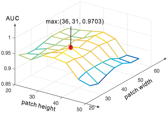 In order to understand of how patch size influences the performance, we evaluate the performance with different patch sizes, and the results are reported in Figure 10. We have obtained the highest AUC of with patch size: . In the experiments, We use a patch size of instead of the optimum one, since this optimum size is obtained with the help of the labels in testing data. From Figure 10, we learn that with the CNN model, patch size of 30–40 can generally yield high performance.