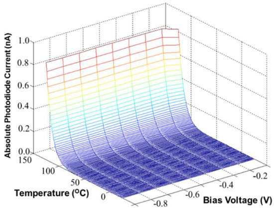 Figure 3. Simulated PD dark currents versus the environmental temperature (°C) and bias voltage (V) in dark conditions.