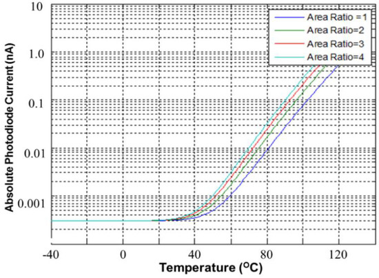Furthermore, the sensing area of the PD is another important factor. The simulated dark current is approximately proportional to the area ratio, which is defined as the ratio of the PD area to 300 μm × 300 μm. Figure 4 shows the simulated dark current as a function of the environmental temperature (°C) in dark conditions. The smaller the area ratio is, the smaller the dark current is. All simulated dark current levels are settled to 0.3 pA due to imperfect diode model, which is provided from foundry. Figure 5 shows the CA of the PD, which operates without dark current cancellation. The resistance of the PD RPD is equal to the voltage drop VPD in the PD divided by its current ILight. The light current of the PD ILight is amplified with a current mirror, whose magnification is approximately equal to (W2/W1) × (W4/W3) × (W6/W5) with equal length (L) for all MOSFETs. Thus, the output current IO can be expressed with the total current gain A: