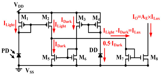 The dark current in Figure 7 must be reduced. Figure 8 displays a CA with enhanced dark current cancellation. The MOSFET size of M3 is two times of that of M4, e.g., (W/L)M3 = 2 × (W/L)M4. As shown in Figure 8, current steering is implemented to draw a different current, ILightIDark, which is equal to the illumination current ILux. The output current IO can then be expressed with the total current gain AE, if (W/L)M1 = (W/L)M2, (W/L)M5 = (W/L)M6, and (W/L)M8 = AE × (W/L)M7. The output current IO in Figure 8 operates without the dark current.