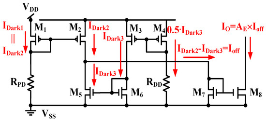When both the DD and PD operate only with dark currents, the two equivalent resistors of the DD and PD are expressed as RDD and RPD, and the current symbols, IDark1, IDark2, and IDark3, denote the dark currents of M1, M2, and M3, respectively. As shown in Figure 9, the output current IO is obtained.