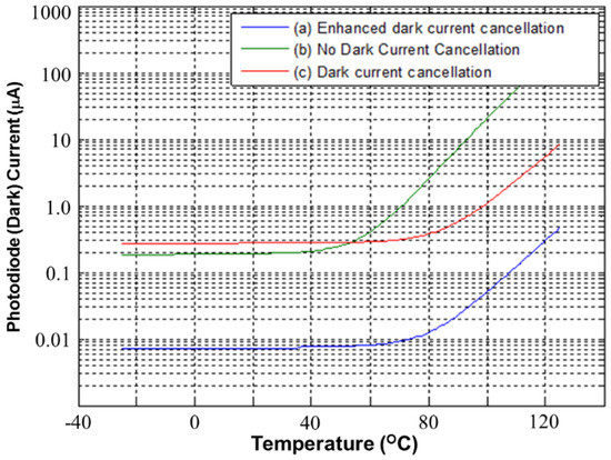 Figure 10 presents the simulated PD dark current versus temperature for CAs. Three types of CA were compared. First, the proposed CA with enhanced dark current cancellation is indicated by Figure 10a. Next, a CA without dark current cancellation is denoted by Figure 10b. Finally, a CA with dark current cancellation is denoted by Figure 10c. According to the simulated results, the proposed CA with enhanced dark current cancellation operates with the lowest dark current. This means that the dark current can be cancelled perfectly with the proposed CA. The CA without dark current cancellation, which is denoted by Figure 10b, operates with a larger dark current. Note that the dark current level of curve Figure 10c is higher than that of Figure 10b below approximately 50 °C, because the magnification of curve Figure 10c is higher than that of curve Figure 10b.