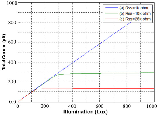 Figure 11. Simulated total currents versus illumination (lux) for the proposed CMOS light detector.