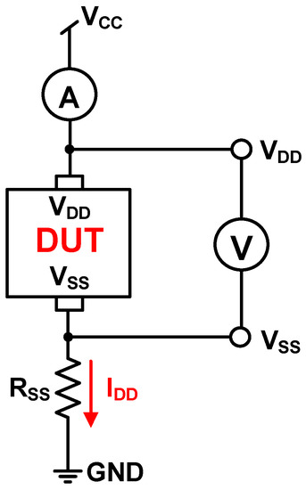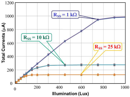 Figure 11 shows the simulated total current IDD of the proposed CA as a function of illumination at three external resistances, namely RSS = 1 kΩ, RSS = 10 kΩ, and RSS = 25 kΩ. As shown in Figure 11, a lower RSS expands the illumination detection range. Two higher resistances, RSS = 10 kΩ and RSS = 25 kΩ, sharply force the proposed CA into saturation at 280 lux and 140 lux, respectively. Thus, for wide application, selecting a low RSS is beneficial. Figure 12 shows the setup of the proposed CA that was used for measurement, with a current meter (A), voltage meter (V), and the design under test (DUT) chip. The external resistance RSS was used to measure the total current IDD, which was varied by applying illumination (lux) with white LED light.