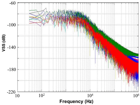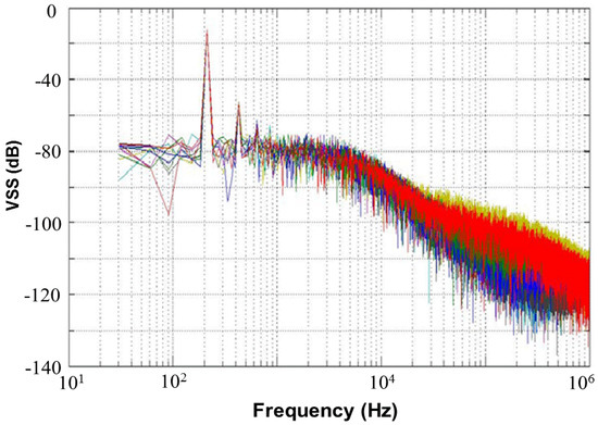 Figure 13 shows a 65,536-point FFT simulation with a noise level of 80 dB and an external resistor RSS of 1 kΩ for the proposed CMOS light detector. This figure presents a simulated frequency response of 10 Monte Carlo samples with random noises at node VSS, which is shown in Figure 12. If a photodiode current signal, which is a superposition of a 250 lux (peak-to-peak) noiseless sine wave with a frequency of 210 Hz and a DC 500 lux, is fed to the proposed CMOS light detector, a plot of the frequency response of the simulated 10 Monte Carlo samples with random noises is made in Figure 14 at node VSS for the proposed light detector. The current signal with frequency of 210 Hz performs without any random noises. Table 3 shows the simulated total harmonic distortions (THDs), signal-to-noise ratios (SNRs), and signal-to-noise+distortion ratios (SNDRs) of the 10 Monte Carlo samples with random noises at node VSS of Figure 14 for the proposed light detector. As shown in Table 3, those simulated results of THD, SNR, and SNDR are roughly consistent. The Monte-Carlo approach can capture very nonlinear noise behaviors.