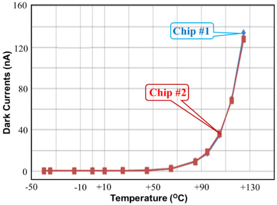 Figure 15 shows the measured dark current versus temperature for the proposed CA with enhanced dark current cancellation. The maximum dark current is approximately 135 nA at 125 °C. This measurement proves that the proposed CA performs with low dark current as a function of the environmental temperature. According to the measurements in Figure 15, the device performs with zero dark current at temperatures lower than 50 °C and exhibits an exponential relation at temperatures higher than 50 °C. Notice that two measured dark currents are consistent in Figure 15, although chip #1 and chip #2 perform with different maximum dark currents at 125 °C.
