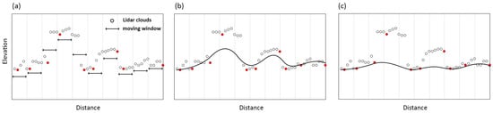 The schematic diagram of statistical analysis-based DTM generation method. (a) Raw Lidar points; (b) Global (local) high points filtered through statistical analysis; (c) DTM generated without filtered points.