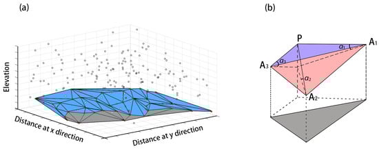 The schematic diagram of morphology-based DTM generation method. (a) Some of the lowest points are selected as preliminary ground points and form a coarse TIN; (b) Rest points are examined using triangles within this TIN model.