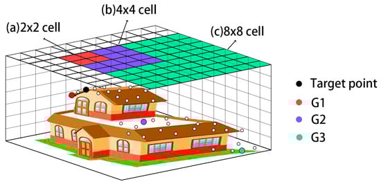 Figure 6 is explained as follows. First, the target point is compared with the lowest point G1 in a 2 × 2 cell using a slope threshold λ1 (comparatively small). If the slope between the target point and G1 is larger than λ1, then the target point is more likely from a small non-ground object and thus set as a non-ground point. If the slope is smaller than λ1, then the target point is further compared with the lowest point G2 in a 4 × 4 cell using a slope threshold λ2 (larger than λ1). By analogy, if the slope between the target point and G2 is larger than λ2, then the target point is more likely from a middle non-ground object and set as a non-ground point. If the slope is smaller than λ2, then the target point is further compared with the lowest point G3 in an 8 × 8 cell using a slope threshold λ3 (larger than λ2). If the slope between the target point and G3 is larger than λ3, then the target point is more likely from a middle non-ground object and set as a non-ground point. If the slope is smaller than λ3, then the target point is set as a ground point.
