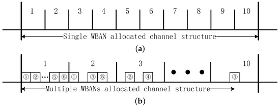 This paper investigates two types of channel structures for channel hopping mechanisms. Take 10 channels for instance, Figure 1a indicates the scenario that operations of different WBANs are not permitted in the same channel, which represents the implementation environment of plain channel hopping mechanisms. Once the coexisting WBANs are detected, the WBAN chooses another free channel and switches all their sensors to achieve an accessible operation [12]. We illustrate this structure to be single WBAN allocated channel structure. In Figure 1b, multiple WBANs are allowed to be allocated to the same channel, i.e., channel-shared coexistence technologies are integrated into channel hopping mechanism [11]. We illustrate this structure to be multiple WBANs allocated channel structure. Without loss of generality, this paper assumes that all the channels are identical. We employ a definition of coexistence capacity as the maximum number of WBANs that each channel supports. Thus the coexisting scenario under single WBAN allocated channel structure can be signed as 1-tolerated channel conflict model and the coexisting scenario under multiple WBANs allocated channel structure with CC = m can be signed as m-tolerated channel conflict model. As analyzed in Section 2.2, we investigate the channel coexistence capacity within the interval , i.e., m = 1, 2, 3, 4, 5, 6. Coexistence capacity provides a normalized formulation for channel hopping mechanisms, which benefits the coexistence capability analysis of these common channel hopping mechanisms.