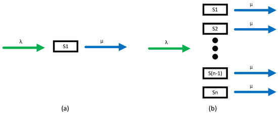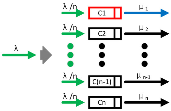 - Ivo Adan, J.R. Queuing Systems; Department of Mathematics and Computing Science, Eindhoven University of Technology: Eindhoven, The Netherlands, 2015. [Google Scholar]