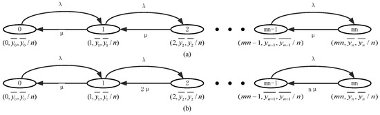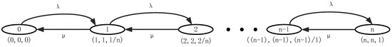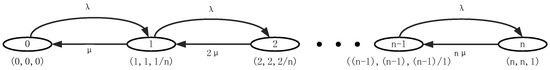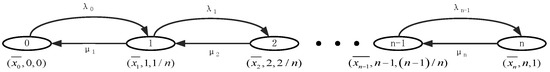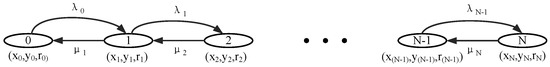 To build a general analysis model, we set , which is the coexisting state space, N is the maximum index of coexisting state. Let be the state parameter pairs, in which is called Coexisting-WBAN Parameter, indicating the number of coexisting WBANs, is called Busy-channel Parameter, indicating the number of busy channels. Let be the Risk Parameter, which is depending on the ratio of busy channels according to Definition 1. As the coexisting WBANs system can be considered as a queuing system, the state transition diagram is illustrated as Figure 4.