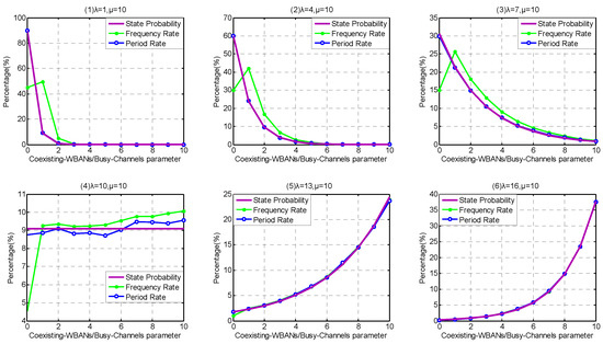 For coexisting WBANs system, the probability of each state in Figure 4 is called State Rate. Accordingly, we define the Coexisting-WBAN Parameter Rate and Busy-channel Parameter Rate as the probability of Coexisting-WBAN Parameter and the probability of Busy-channel Parameter, respectively. Similarly, the duration of each state in Figure 4 is called State Period. Accordingly, we define the Coexisting- WBAN Parameter Period and Busy-channel Parameter Period as the duration of Coexisting-WBAN Parameter and the duration of Busy-channel Parameter, respectively.