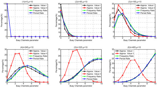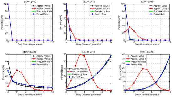 Similarly, Figure 19(1) and Figure 20(1) confirm that our theory for Channel Saturation Rate estimation is successful. As shown in Figure 19, the parameter coexistence capacity has little influences on the simulation result in Service-dependent coexisting WBANs, and the Channel Saturation Rate is mainly dependent on λ. On the contrary, both coexistence capacity and λ have obvious influences on Channel Saturation Rate, as shown in Figure 20. Comparing with Approximate Method I, Approximate Method II is totally defeated. Therefore, we don’t recommend employing Approximate Method II to estimate Saturation Rate. As the interfering WBANs have an inevitable coexistence conflict when coexisting WBANs are in Saturation State, the rejection of joining requires leads to terrible communication interruptions. Therefore, Channel Saturation Rate can also be employed to reflect the robustness.