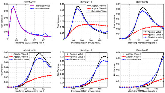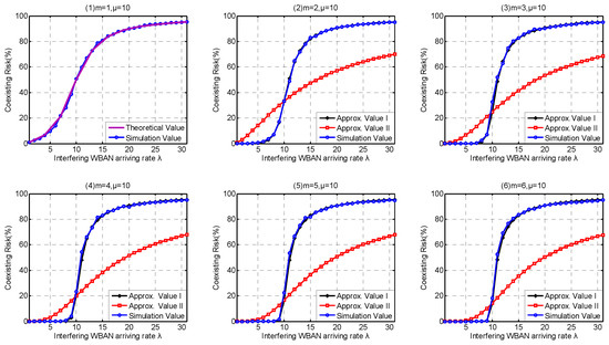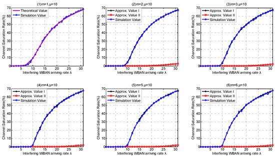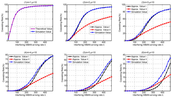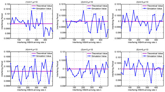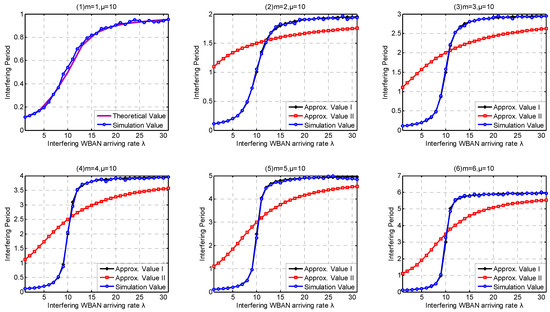 As shown in Figure 21, Approximate Method I performs better than Approximate Method II on Interfering Period estimation. Interfering Period in Service-dependent coexisting WBANs increases along with the arriving rate λ until it reaches to , the upper bound of Interfering Period representing the residence period in saturation state. As analyzed in Section 5.2, we provided the theoretical value of Interfering Period in Service-independent coexisting WBANs. Because there is no queuing waiting time, the parameters we adopted have no effect on the Interfering Period except the leaving rate . As shown in Figure 22, the simulation values fluctuate around the simulation values.