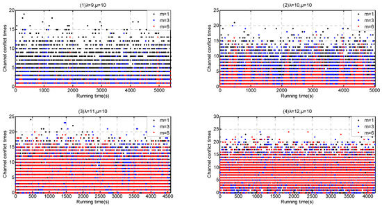 Since channel conflicts have a serious influence on the performance of coexisting WBAN, this part employs channel conflict times in each time unit to provide an intuitive performance evaluation of the enhanced channel hopping mechanism. Literature [12] has also employed the same evaluation indicator in their work.