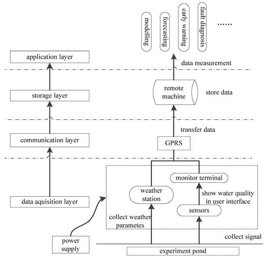 The aquaculture IoT includes a data acquisition layer, transmission layer, storage layer and application layer, as shown in Figure 1. As the lowest level in the hierarchy, the data acquisition layer consists of different kinds of sensors, a weather station and monitor terminals (collectors) deployed in the experimental base. The weather station collects environment parameters in the pond microclimate. Sensor probes monitor water quality in real time by obtaining suitable signals. Then, these signals are transmitted to a monitor terminal. To make these signals readable, they are processed in a particular way, so water quality can be displayed in the user interface. Then, data is communicated via general packet radio service (GPRS, the communication layer in the hierarchy) and stored in a remote machine (storage layer). In the application layer, data are measured by different methods corresponding to different usage, like modeling, forecasting, early warning, and in this research, fault diagnosis. Besides, it’s very important to provide power, battery power and main supply, to the equipment in the base pond. In this study, the experimental base was located in Gaocheng Town, Yixing City (Jiangsu Province, China). The test ponds are 270 m long, 76 m wide, and 1.2 m deep. The IoT System consists of water quality sensors, wireless collectors, weather stations, and monitoring terminals.