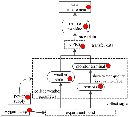 Thus faults definition is important and necessary for fault diagnosis in the aquaculture IoT. The faults are classified based on the fault location and numerical characteristics. In fact, a fault can occur at different locations. The red spots in Figure 2 show the possible locations where a fault can occur.