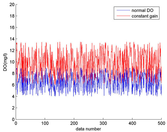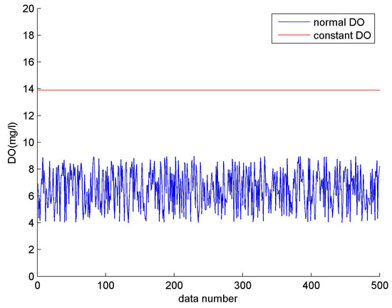 Take the dissolved oxygen (DO) for example. A comparison between a constant failure and a normal output is shown in Figure 3. Normal DO ranges from 4–9 mg/L (blue line), while the collected value remains unchanged at 13 mg/L, and this faulty constant output is represented by the red line.